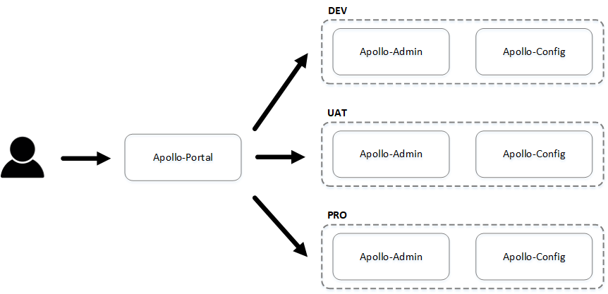 Apolloe 是由Portal、Admin、Config 三個模塊組成,Portal主要是管理後台,再通過不同的配罝,訪問不同環境的配罝中心,若實際應用上有需要DEV、UAT、PRO三個環境,則會需要三套Admin+Config